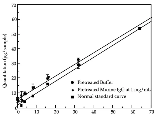 また、両タンパク質のy-切片の差は≤1 pgです。これらの事実と簡略化のため、これらのグラフでは、すべての前処理サンプルのデータを表すために1本の線を使用しています。