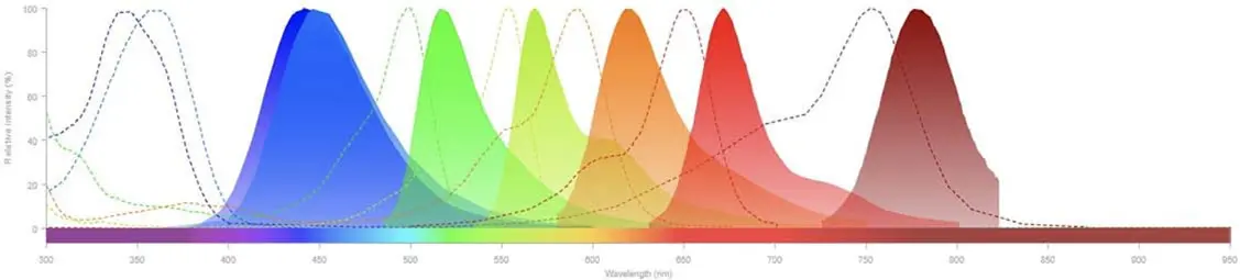 蛍光色素はそれぞれ固有の励起および発光スペクトルを有しており、これが測定の感度や精度に影響を及ぼす可能性があります。SpectraMax®マイクロプレートリーダーは、波長選択、バンド幅、励起・発光波長の組み合わせなど、装置構成や設定が異なっており、これらの違いが各種蛍光色素に対する性能に影響を与えます。検出下限(LLD)は、バックグラウンドノイズから信頼性をもって識別可能な蛍光色素の最小濃度を示す重要な指標であり、比較において中心的な役割を果たします。