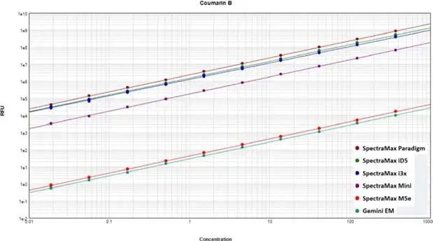 * SpectraMax Miniのフィルターキューブ構成については表10をご参照ください。表3. SpectraMaxマイクロプレートリーダーにおけるCoumarin Bの検出下限および励起/発光波長の組み合わせ
