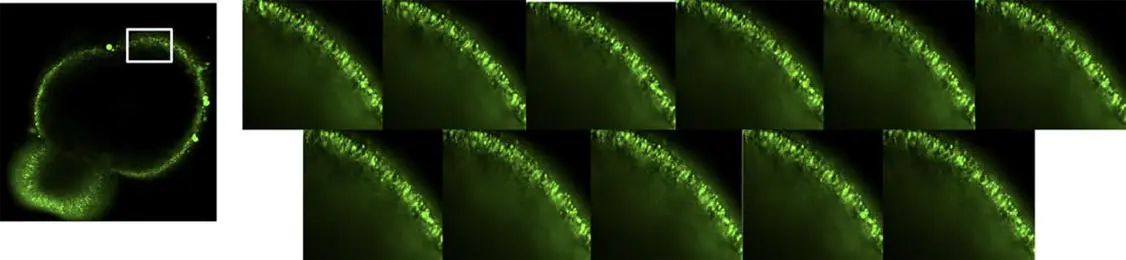 図5. 網膜オルガノイドの断面画像と視細胞活動の時系列変化 ImageXpress Micro Confocalシステムを用いて取得した網膜オルガノイドの4倍断面画像(左)と、同一領域の20倍画像を提示しています。100秒間にわたる時系列画像により、視細胞活動の変化とオルガノイド内部の動的応答が明らかとなりました。