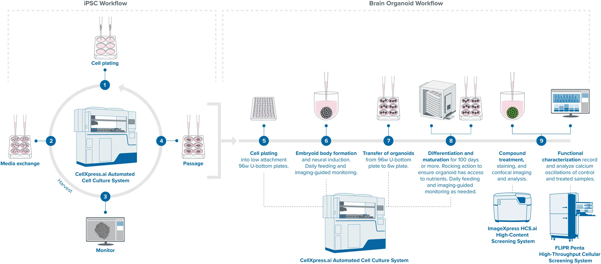 iPS細胞から始まり、形態学的および機能的解析に至るまでの脳オルガノイド培養・解析ワークフローをオートメーション化