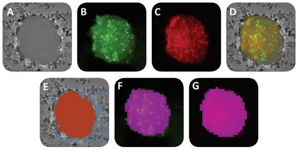 図2. FUCCIスフェロイドの画像。A: 透過光、B: 緑色蛍光、C: 赤色蛍光、D: 透過光、緑色および赤色画像を重ねた合成画像、E: SoftMax Pro ソフトウェアにより赤色オーバーレイとして識別されたスフェロイドと、ソフトウェアによりグレーで識別され解析から除外された破片や個々の細胞などのその他のオブジェクトを含む透過光画像。F:同定された領域(物体)が紫色のオーバーレイとして示された緑色の蛍光画像。G:対象物をオーバーレイ表示した赤色蛍光画像。ソフトウェアによって特定され、オーバーレイとして表示された領域が画像解析に使用されました。