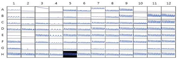 図3. 化合物処理された心筋スフェロイドの動態蛍光強度 画像データはSoftMaxPro 7ソフトウェアにインポートされ、拍動率、振幅、ピーク幅などの解析が行われました。図はタイムラプス強度プロットのプレートビューを示しています。