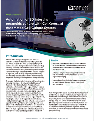労働集約的な手動プロトコールに起因するボトルネックを軽減するために、私たちは複雑なワークフローを長引かせるためのオルガノイド培養プロセス全体を自動化するCellXpress.ai™自動細胞培養システムを開発しました。CellXpress.aiシステムは、リキッドハンドリングからエンドポイントアッセイの実行、複雑な画像解析まで、AI主導のエンドツーエンド細胞培養管理を提供します。このアプリノートでは、マトリックスドームで一般的に使用されている他の3Dオルガノイドプロトコルの基礎として使用できる自動腸管ワークフローの結果を紹介します。