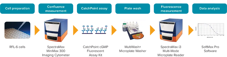 この研究では、CatchPoint® cGMP Fluorescent Assay KitとSpectraMax® i3 MultiMode Detection Platformを組み合わせることで、心房性ナトリウム利尿ペプチド(ANP)で処理したRFL-6細胞のcGMPを測定できることを実証します[1, 2]。図1のアッセイワークフローをご参照ください。