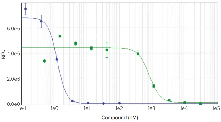 図1. HeLa細胞をパクリタキセル(青丸)またはエトポシド(緑四角)で48時間処理しました。パクリタキセル、IC50 = 1.4 nM;エトポシド、IC50 = 0.81 μM。IC50値はSoftMax Proソフトウェアで計算しました。