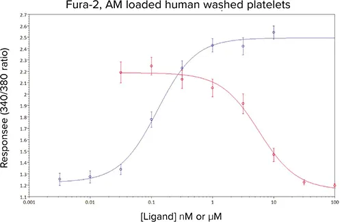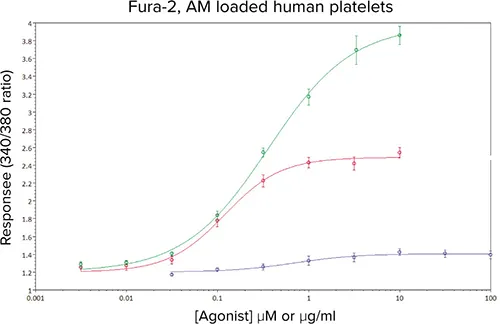 ここでは、高親和性蛍光カルシウム指示薬Fura-2, AMを用いて、ヒトの主要組織であるヒト血小板のCa²⁺フラックスをマイクロプレートフォーマットで容易に測定することが可能であることを示します。96ウェルハーフエリアマイクロプレートでアッセイを小型化し、FlexStation® 3 マルチモードマイクロプレートリーダーのフレキシブルな液体移動機能を用いることで、アゴニストのEC₅₀値とアンタゴニストのIC₅₀値を迅速かつ確実に測定できることを示します。