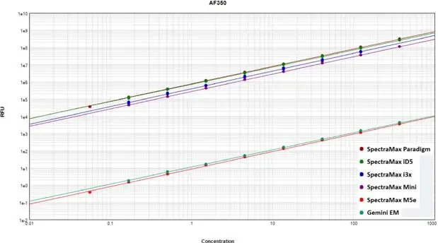 図2. SpectraMaxマイクロプレートリーダーで読み取ったAlexa Fluor 350の標準曲線