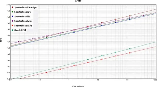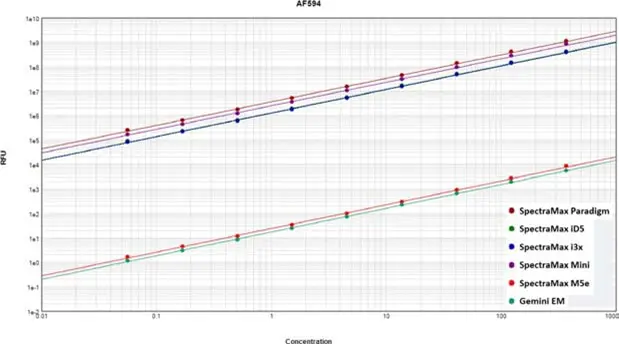 蛍光色素はそれぞれ固有の励起および発光スペクトルを有しており、これが測定の感度や精度に影響を及ぼす可能性があります。SpectraMax®マイクロプレートリーダーは、波長選択、バンド幅、励起・発光波長の組み合わせなど、装置構成や設定が異なっており、これらの違いが各種蛍光色素に対する性能に影響を与えます。検出下限(LLD)は、バックグラウンドノイズから信頼性をもって識別可能な蛍光色素の最小濃度を示す重要な指標であり、比較において中心的な役割を果たします。