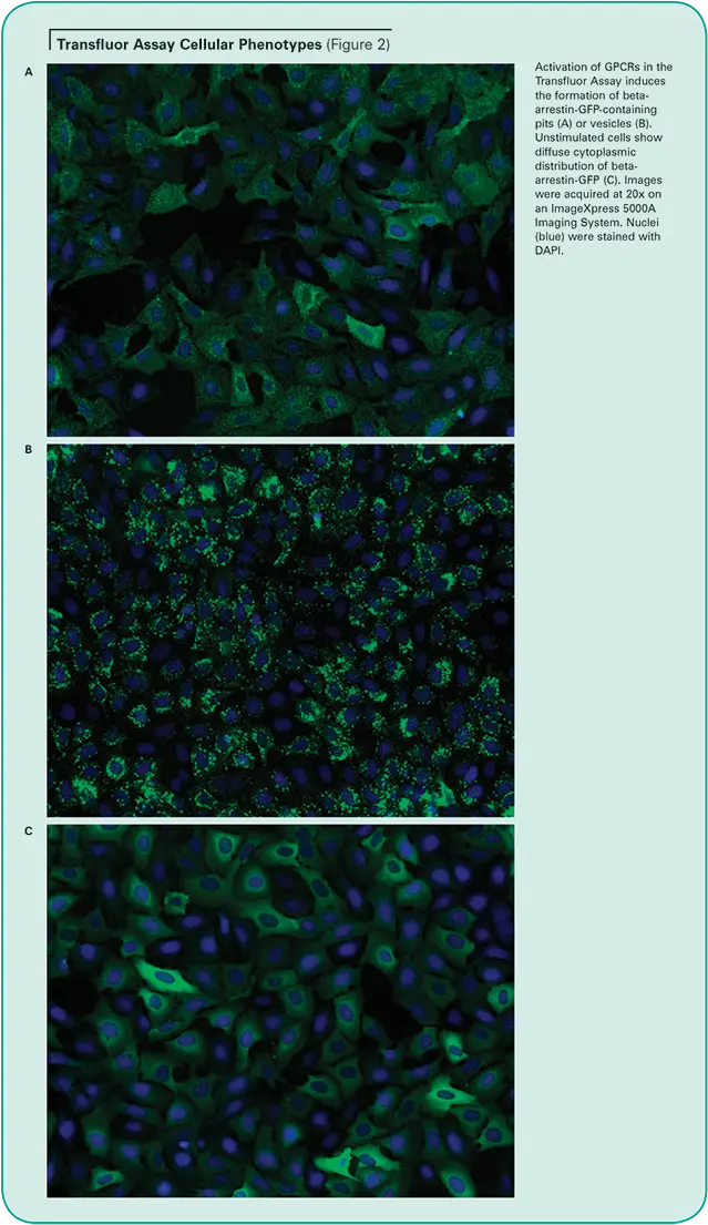 刺激されていない細胞は、細胞質にβ-アレスチン-GFPの蛍光が散在しています。過剰発現されたGPCRが活性化されると、β-アレスチンはレセプターを標的として内在化し、その結果、小さな蛍光を発するクラスリンコートピットが出現します。受容体がβアレスチンに対して高い親和性を持つ場合、細胞はその後、ピットよりも大きく明るい蛍光エンドサイトーシス小胞を形成します。(Transfluor Assayは、GPCR活性化の下流で起こる生理学的事象の機能的測定法として、多くの医薬品創薬業務において、一次および二次スクリーニングとして広く採用されています(図2参照)。