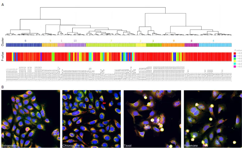 クラスタリング解析。A)階層的関係を示すデンドログラムを表示しています。同じクラスターに属するウェルは、番号付きのカラーバーで示されています。各ウェルには、距離スコアに基づくp値が表示されています。B)同一クラスターに分類された化合物処理細胞の代表的な画像を示しています。クラスター5には、テトランドリンおよびクロロキン処理細胞が含まれており、両ウェルにおいて小胞体(ER)の点状構造(punctae)の増加が確認されます。クラスター4には、ロテノンおよびパクリタキセル処理細胞が含まれており、これらのウェルに属する細胞の一部にはブレッビング(細胞膜の膨出)が見られ、細胞毒性の影響が示唆されます。