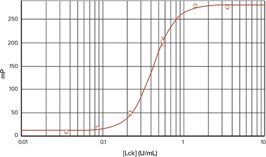 図2. SpectraMax M5マイクロプレートリーダーを用いたIMAP FPキナーゼアッセイ。SpectraMax M5で読み取った、0.04から3.5単位/mLの酵素にFAM-p34cdc2由来ペプチドを加えたLckキナーゼ希釈曲線です(4パラメータ曲線フィット)。エラーバーは標準偏差です。