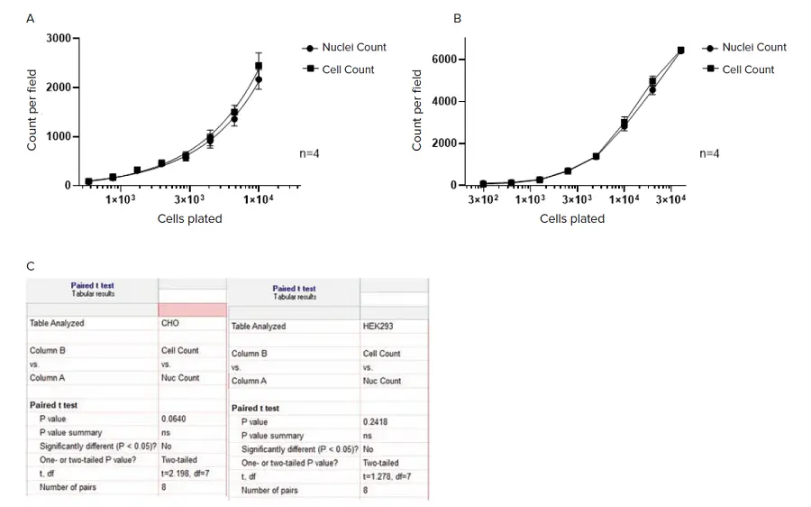 図5. SINAPでセグメンテーションされたラベルフリー細胞と、Nuclei Robustセグメンテーションで蛍光チャンネルにセグメンテーションされた核の計数。画像セグメンテーションと解析はIN Carta画像解析ソフトウェアv1.15を用いて行いました。A) CHO細胞;画像はImageXpress Microハイコンテントイメージングシステム、対物レンズ10倍で取得。B) HEK 293細胞;画像はSpectraMax® MiniMax™ 300イメージングサイトメーター、対物レンズ4倍で取得。すべてのデータは4ウェルの平均(±SD)。C) Paired t-test分析をGraphPad Prizmソフトウェアで行いました。