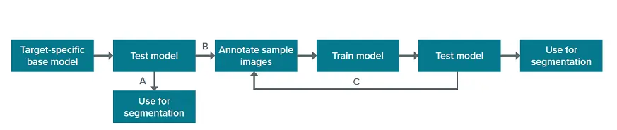 IN CartaのSINAPモジュールには、注釈付き画像が大規模なセットでトレーニングされた特異性の生物学的構造のベースモデルが含まれています。このベースモデルは、対物レンズのセグメンテーションに直接使用することができます(図1のA)。対物レンズを出発点として、そこからさらにアルゴリズムを "ティーチング "して、サンプル中の対象オブジェクトを除外し、目的の生物学的構造を認識することもできます(図1のB)。モデルの性能を向上させるためのこのようなアルゴリズムのさらなる学習は、ユーザー注釈付き画像を使用したユーザーフレンドリーなSINAPワークフロー内で行われます。学習プロセスは反復可能であり、モデルを改善するためにさらに多くの画像に注釈を付けることができます(図1、C)。