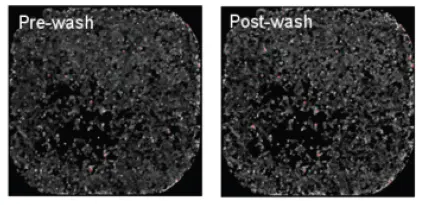図2. 洗浄したHEK293細胞の384細胞洗浄用ヘッド残存率。384ウェル細胞洗浄用ヘッドで洗浄したHEK293細胞の細胞残存率95%以上のイメージング。左と右の画像は、洗浄前と洗浄後の全く同じウェルのものです。(画像上の赤色部分は、蛍光シグナルレベルが最大値の50%であることを示します)。