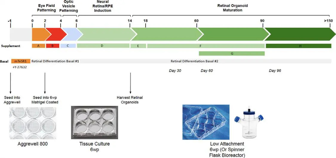 網膜オルガノイドは、STEMdiff™ Retinal Organoid Kitを用いて、野生型(WT)のヒトiPS細胞(hiPSC)から作製しました。hiPSCは、網膜組織の発生を促進する成長因子を添加した培地で培養されました。iPSCを播種後、チェッカーボードスクレイピング法によりオルガノイドを形成し、2〜3日ごとに培地交換を行いながら150〜200日間培養しました。この培養期間中に、オルガノイドは層状構造を形成し、外側領域には光受容体、さらにRPE細胞や神経節細胞などの特徴的な構造が発達しました。