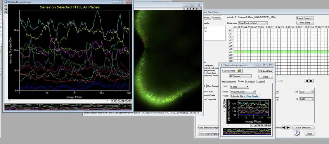 撮像後、MetaXpressソフトウェアを使用して、光受容体層内の特定領域を選択し、活動解析を行いました。時間と蛍光強度の標準偏差を測定することで、光受容体の応答のばらつきを定量化します。このデータはグラフ化することで、異なる領域間の活動を比較でき、時間経過に伴う光受容体機能の理解に役立ちます。