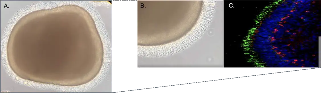 網膜オルガノイドは、ヒト網膜の主要な特徴を再現しており、特に視細胞層においては、桿体および錐体細胞が秩序だった外節構造を形成し、光の検出に関与しています。これらの視細胞は頂端側へと伸長し、光の捕捉および視覚シグナルの開始に寄与します。ただし、すべての網膜オルガノイドが明瞭な網膜色素上皮(RPE)層を形成するわけではなく、特に成熟度の高いオルガノイドではその形成にばらつきが見られます。RPEが明確に形成されていない場合でも、視細胞は機能的な活性を示すことが可能です。