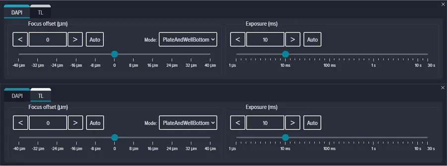 Focus methodを'PlateAndWellBottom'に設定し、Focus offsetを0 μmに設定し、ExposureをDAPIおよび透過光ともに10 msに設定しました(図S2)。Zスタック画像取得を有効にし、Focus Stepを10μmに設定した2平面のスタックを、ウェルの底から+10および+20の位置で取得しました(図S3)。蛍光チャネルと透過光チャネルには、それぞれ最大投影と最良平面投影を選択しました。