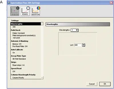 機器はSoftMax Proソフトウェアでプログラムしました。設定はソフトウェアのplate sectionで調整しました(図4)。表4にRSアッセイに使用した機器設定を示します。図4は波長設定と "PathCheck "選択のスクリーンショットです。