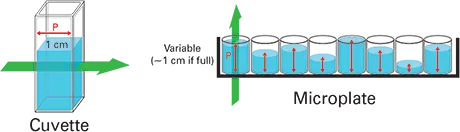図2. キュベットとマイクロプレートでは経路長が異なります