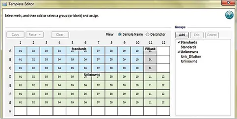 図2. テンプレート設定 Template Editorでウェルを「Standards」および「Unknowns」グループに割り当てることで、標準曲線の自動プロットとデータ解析が可能になります。