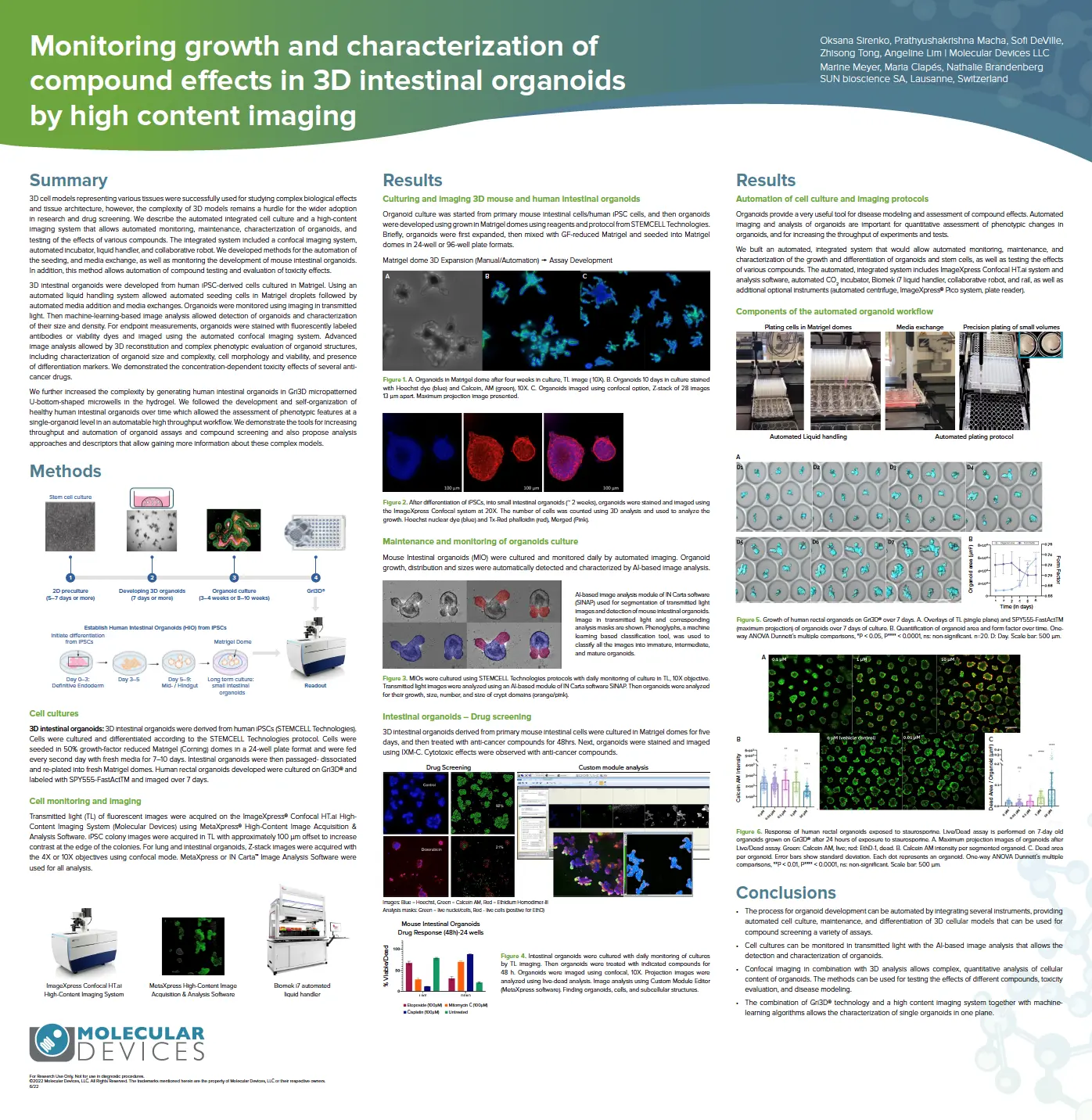 ハイドロゲル内のGri3D®マイクロパターン化されたU底型マイクロウェル内にヒト腸管オルガノイドを作製することにより、さらに複雑性を増しました。我々は、オルガノイドアッセイと化合物スクリーニングのスループットと自動化を向上させるツールを実証し、これらの複雑なモデルについてより多くの情報を提供する解析アプローチと記述子を提案します。