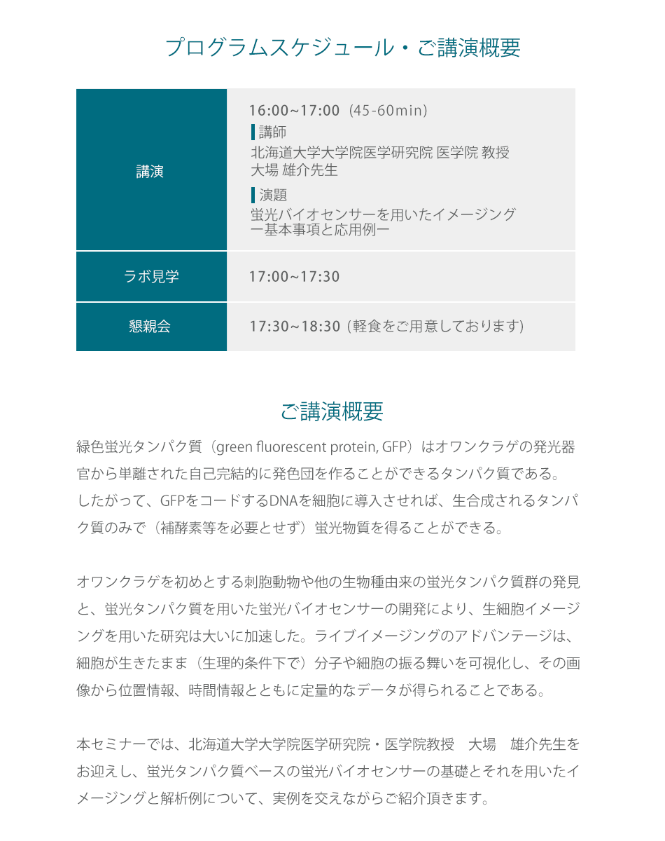第一回目は、北海道大学大学院医学研究院・医学院 教授 大場 雄介先生を外部講師としてお迎えし、蛍光バイオセンサーを用いたイメージング ー基本事項と応用例ー について、ご研究でのご経験もお踏まえ頂きながらご講演頂く運びとなっております。